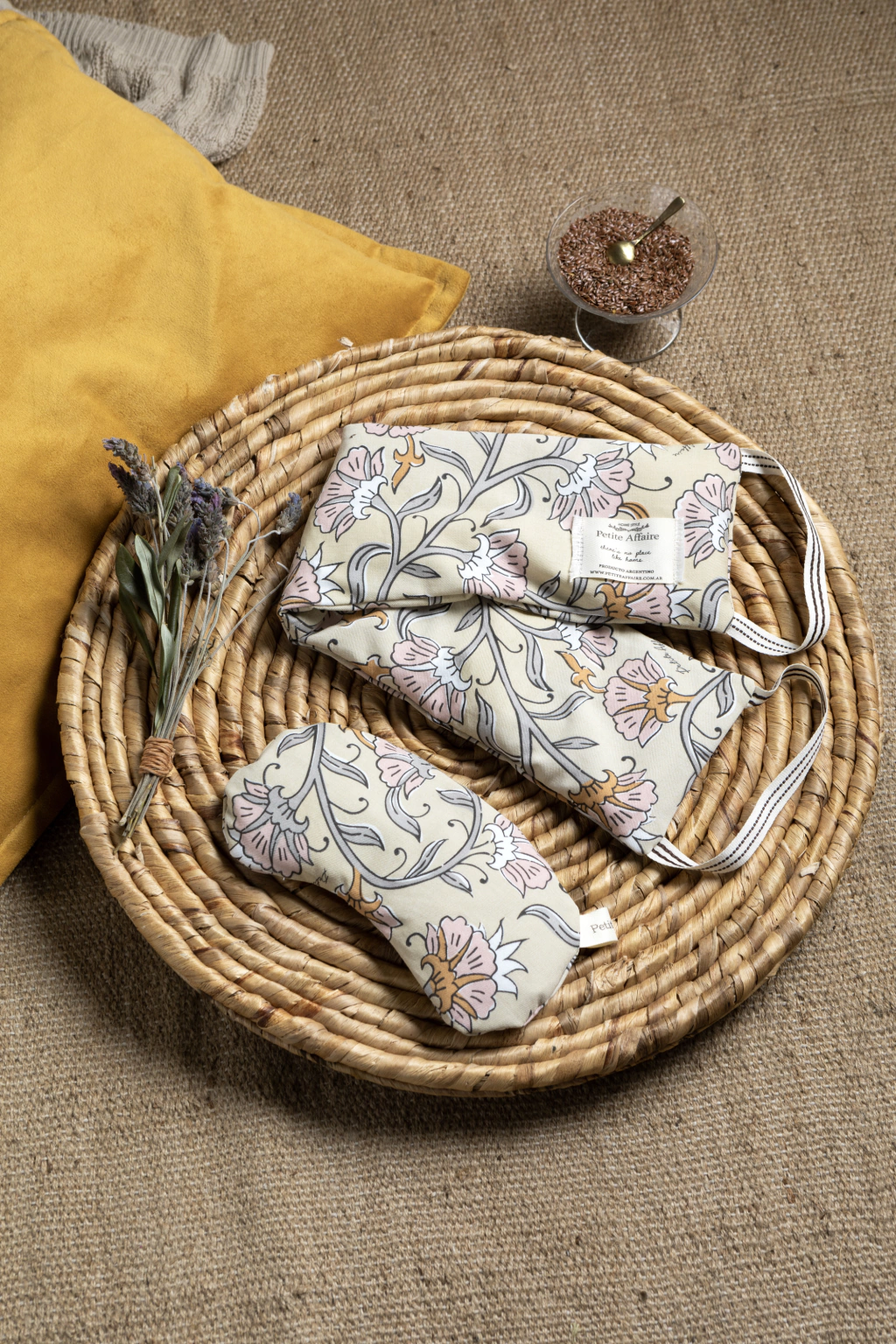 Almohadilla terapéutica rellena de semillas de lino y flores de lavanda.