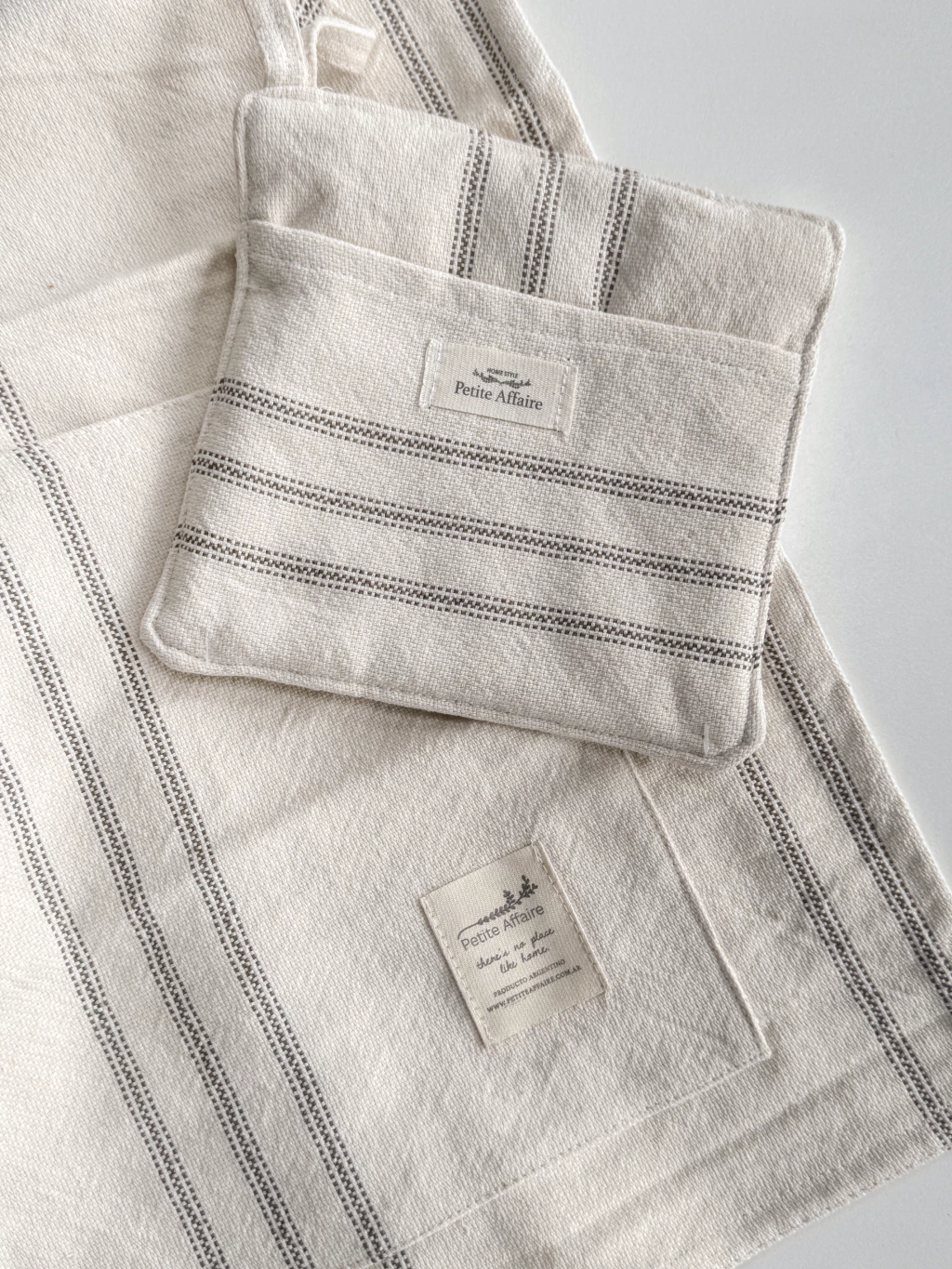 Delantal confeccionado en 100% Algodón. El mismo viene acompañado por una agarradera con bolsillo y tira colgante. El match perfecto para regalarle a los amantes de la cocina.