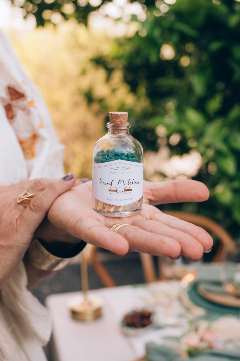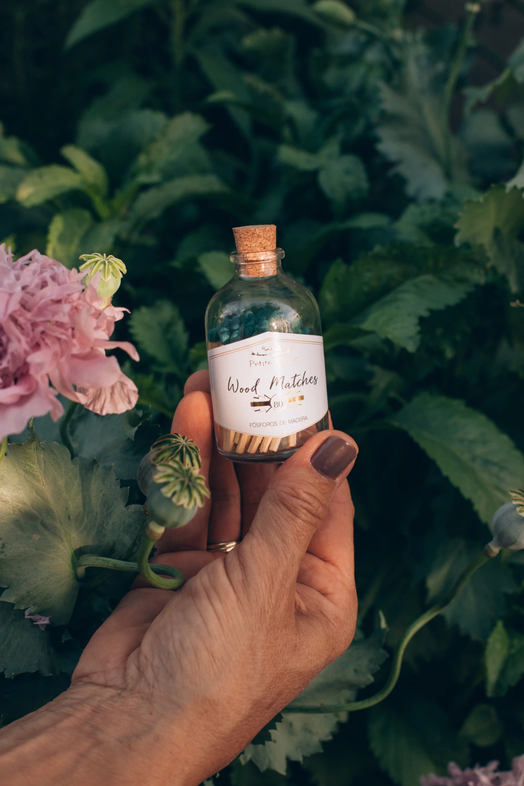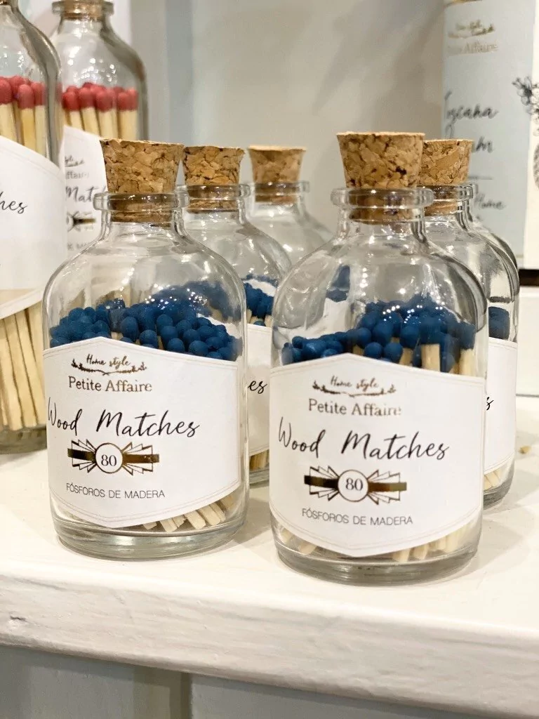 Frasquito de vidrio con tapa de corcho que contiene 80 fósforos de tamaño común de cabeza azul.