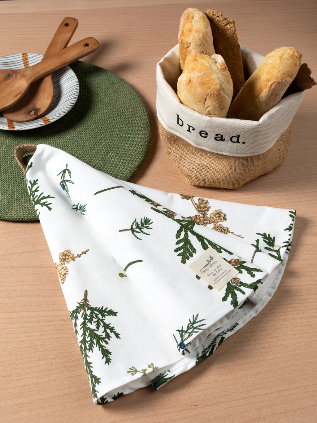 Contenedor reversible de gabardina de algodón crudo combinado con arpillera. Ideal para el pan o las servilletas. Detalle bordado en negro de palabra bread (pan) .