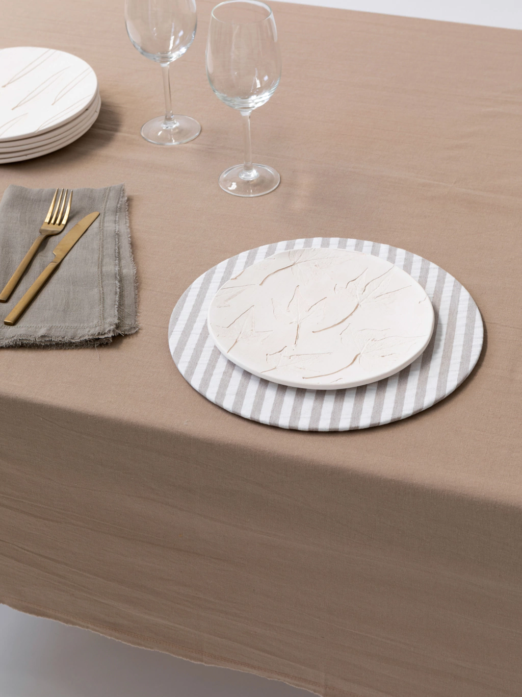 Mantel de tussor color tostado, al corte y con costura tipo bordada. Es un mantel canchero, descontracturado, con terminación de prelavado, muy versátil y adaptable para diferentes ocasiones.