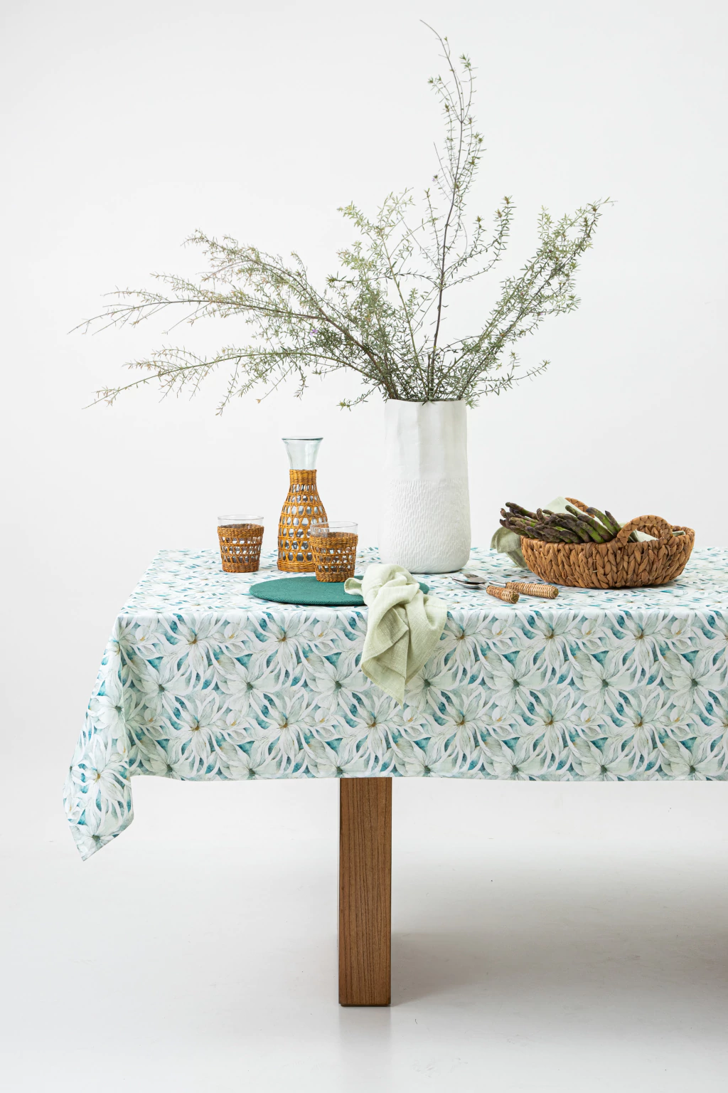 Estampa: diseño botánico en tonos aqua, celestes y verdes.