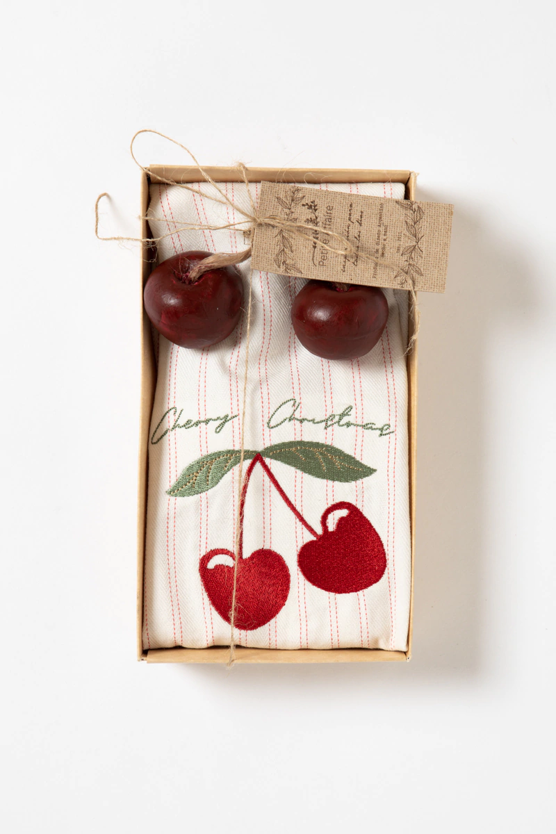 Este paño está pensado para sorprender y enamorar: su estampa exclusiva en tono tostado y el bordado de cerezas con la frase “Cherry Christmas” lo vuelven tan especial como único. Además, viene en caja + 2 jaboncitos con forma de cereza, listos para regalar sin sumar nada más 💝