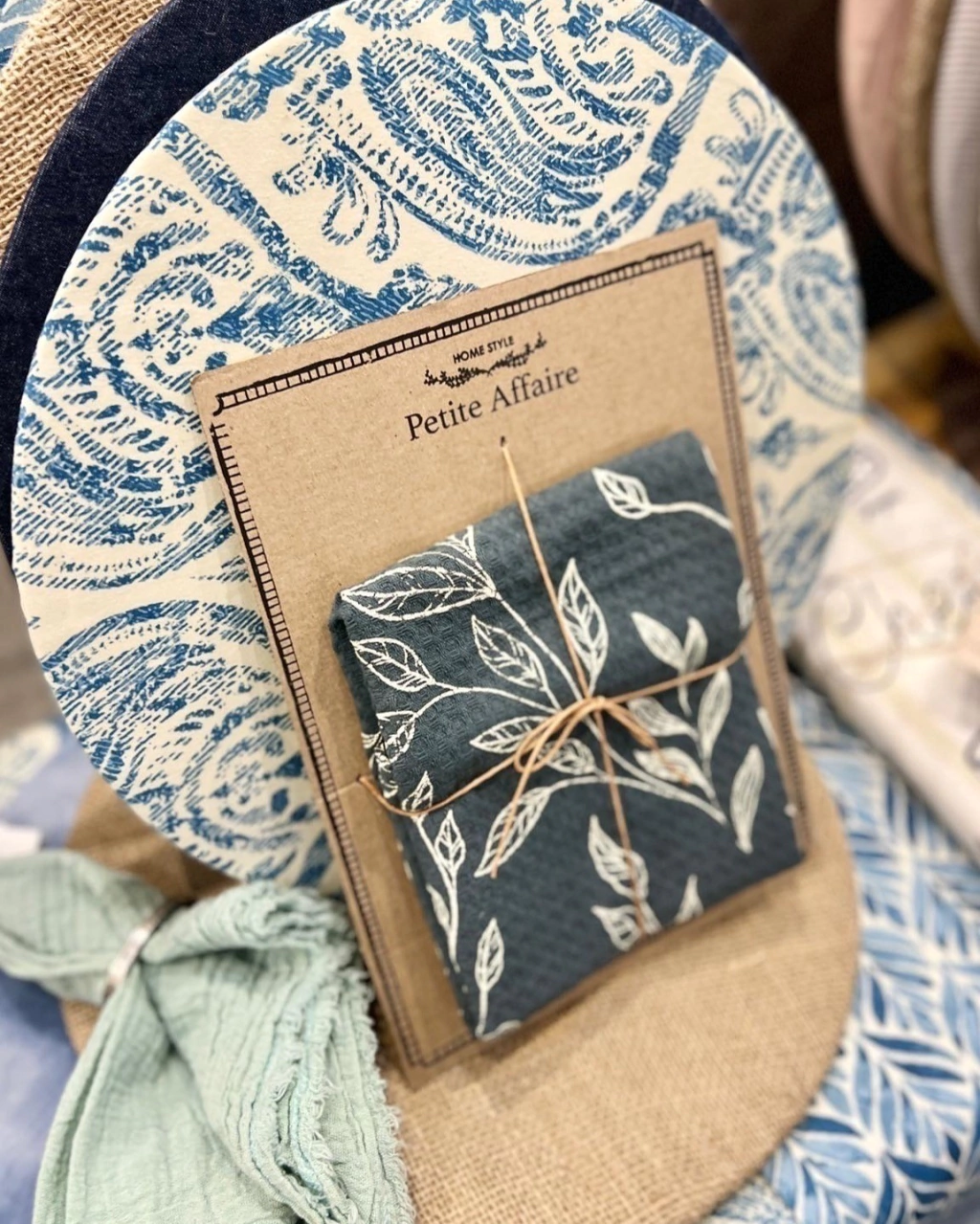 Paño wafle color Deco Ocean con estampa serigráfica manual de hojas en tinta color crudo.